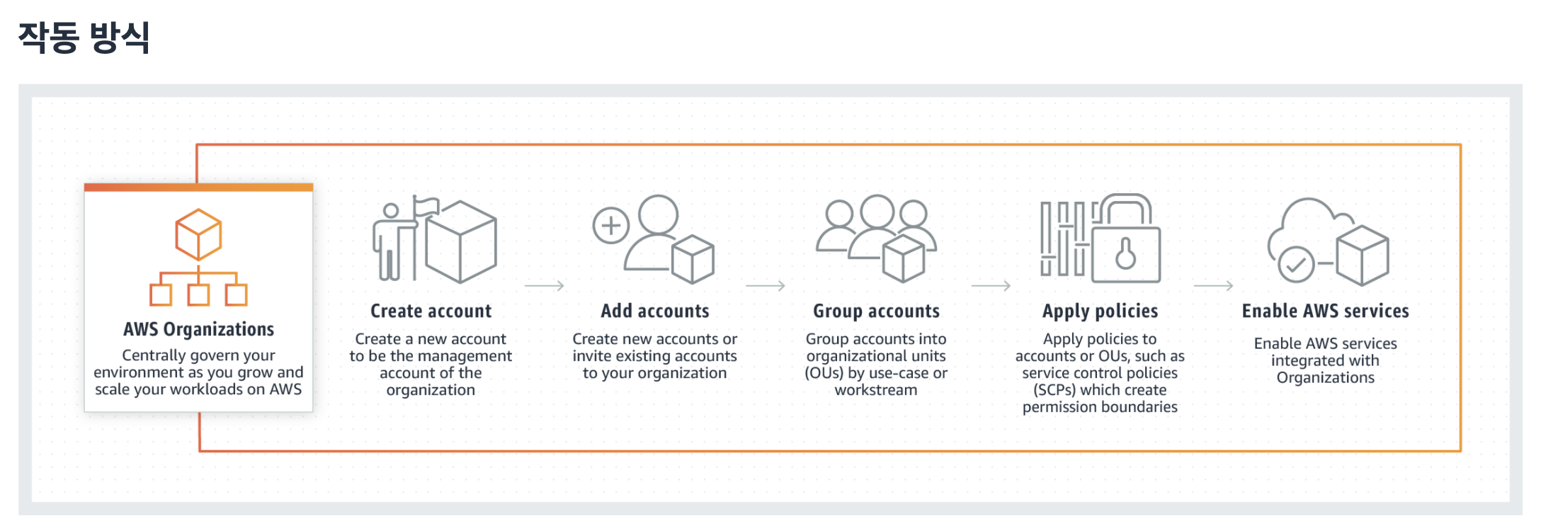 또한, AWS Organizations는 다른 AWS 서비스에 통합되므로 중앙 구성, 보안 메커니즘, 감사 요구 사항 및 조직 내 계정에 걸쳐 공유되는 리소스를 정의할 수 있습니다. 모든 AWS 고객은 AWS Organizations를 추가 비용 없이 사용할 수 있습니다.