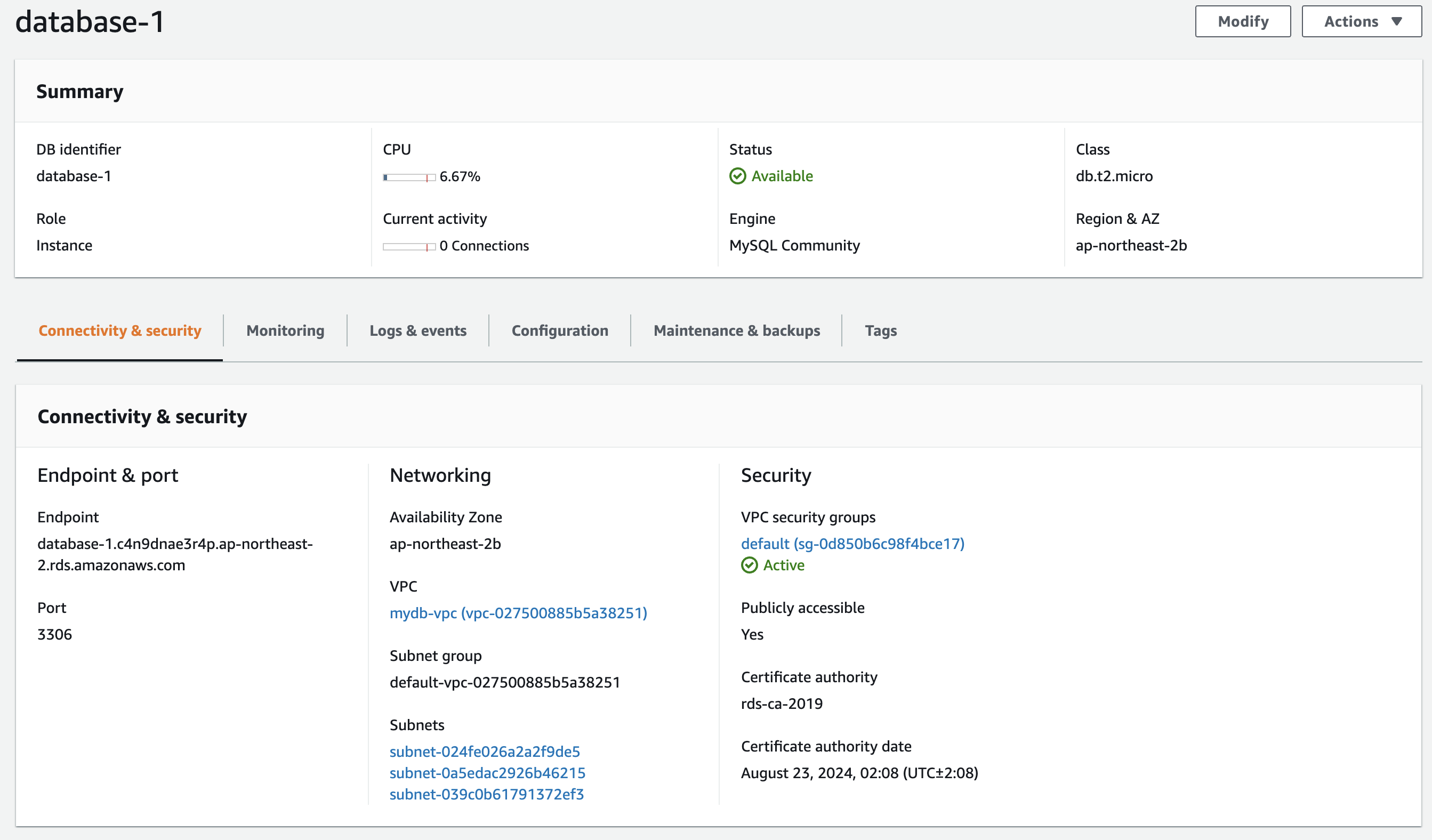DB 인스턴스를 선택하면 아래와 같이 Endpoint를 확인할수 있다.