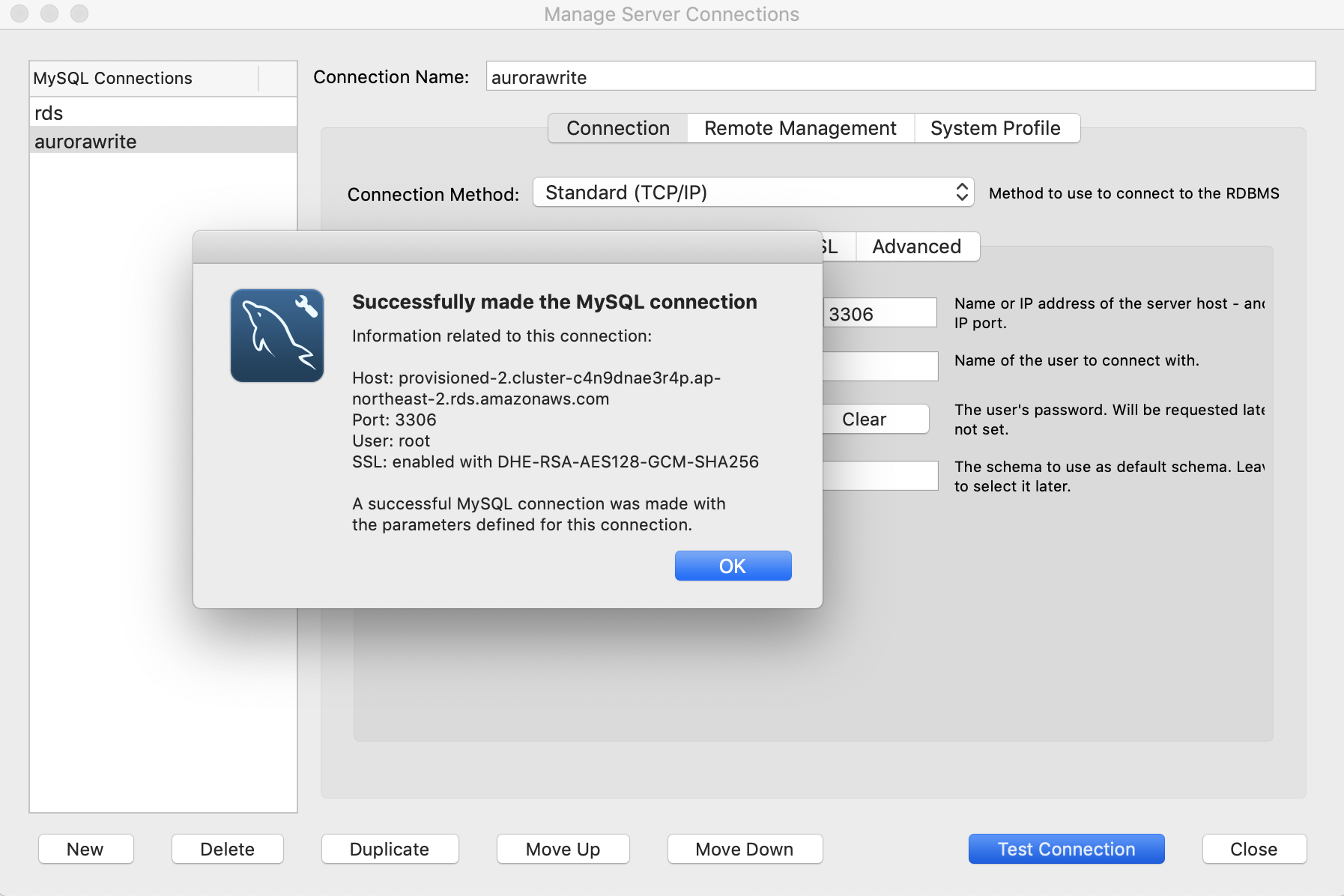 Workbench 실행 -> EndPoint 및 계정정보 입력 -> Test Connection -> Successfully 로그 확인
