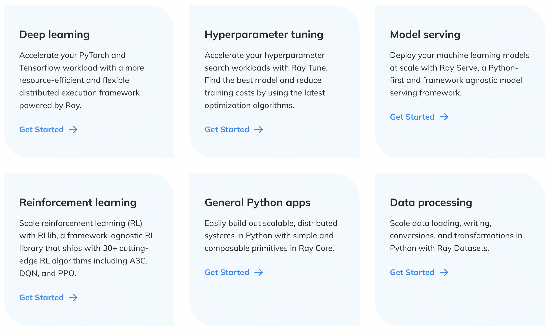 Ray is an open-source unified compute framework that makes it easy to scale AI and Python workloads — from reinforcement learning to deep learning to tuning, and model serving. Learn more about Ray’s rich set of libraries and integrations.